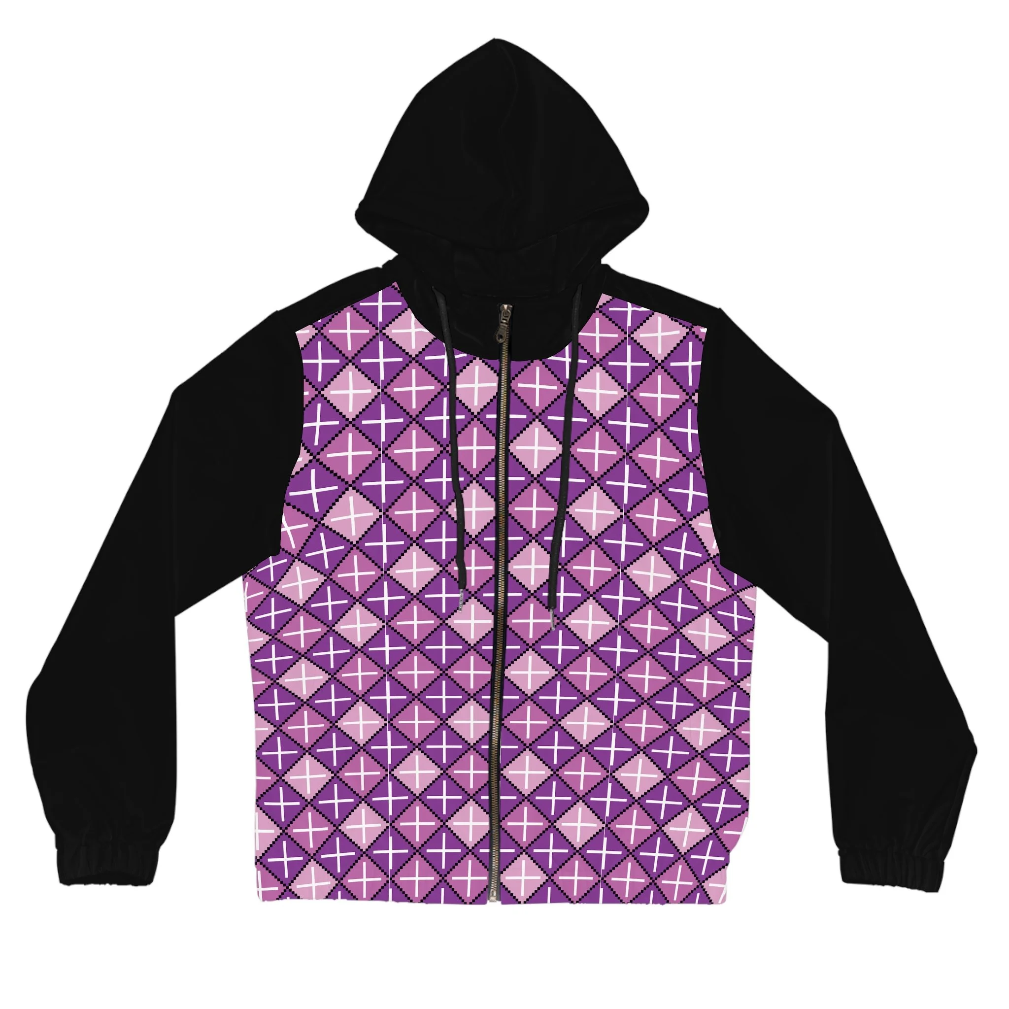 This lightweight full-zip hoodie brings bold geometric style to everyday life. The front panel features a hand-drawn, pink-and-purple lattice of diamonds and crosses that catch the eye without shouting. Black sleeves, hood, and back keep the look grounded, while the gold-colored metal zipper and clean drawstrings add a subtle, polished touch. It moves with you—soft stretch, elastic cuffs and hem, and slanted front pockets make it casual, comfortable, and confidently wearable. Slip it on for cool mornings, late-night coffee runs, or creative meet-ups; it layers easily and keeps your silhouette neat with shoulder-tape reinforcement and a regular fit.