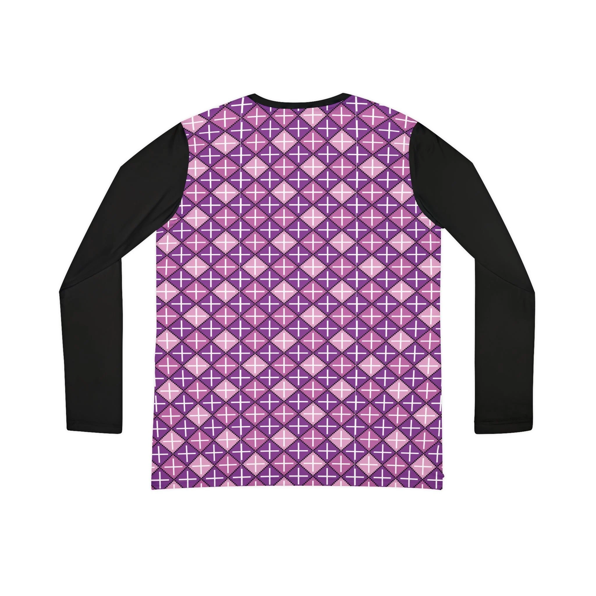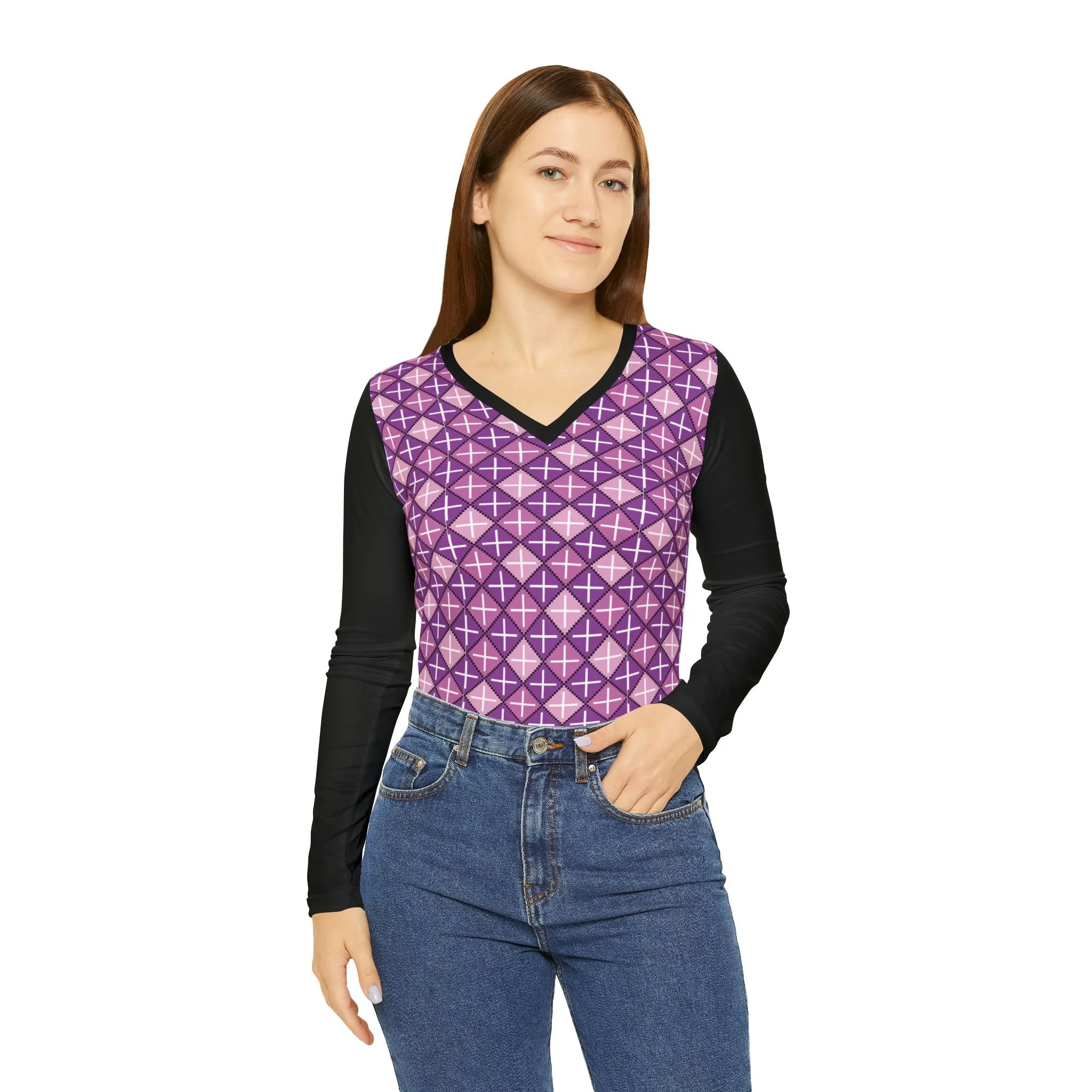 This long-sleeve V-neck brings a cozy, hand-crafted vibe to everyday wear. The all-over geometric print in shades of lavender and plum feels like a modern quilt—soft, rhythmic, and quietly joyful. Lightweight and slightly stretchy, the shirt moves with you whether you're running errands, meeting friends for coffee, or curling up with a book. The contrasting black sleeves and neckline frame the patterned front and back, giving a flattering silhouette that reads casual but thoughtfully styled. Slip it on when you want color that’s calm rather than loud, and comfort that lasts from morning to evening.